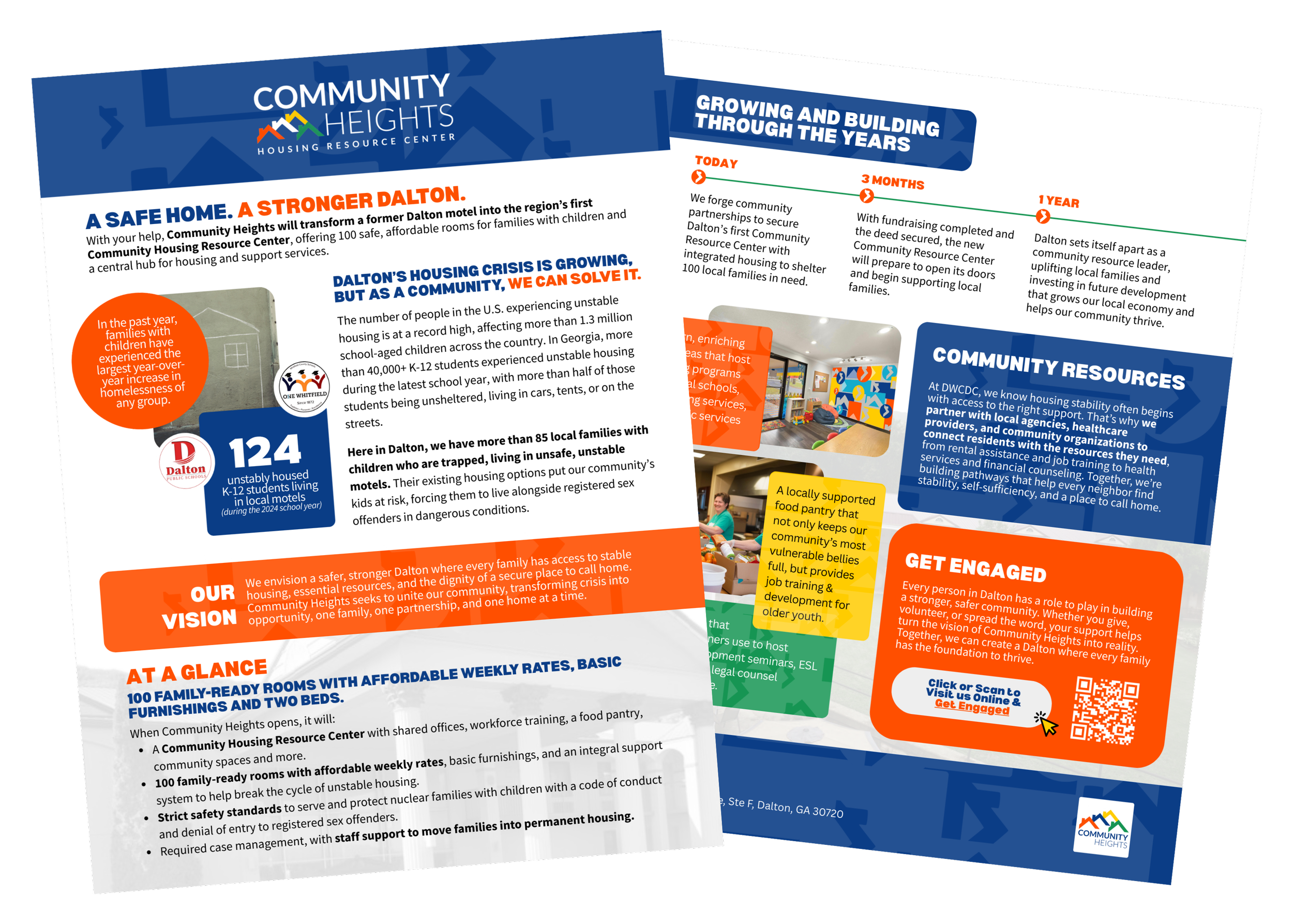 A bespoke, Community Heights campaign landing page to drive education around homelessness in Dalton, GA, the solution that this first-of-it’s-kind housing and resource center presents for residents, and how the local community can get engaged to support the DWCDC’s vision.